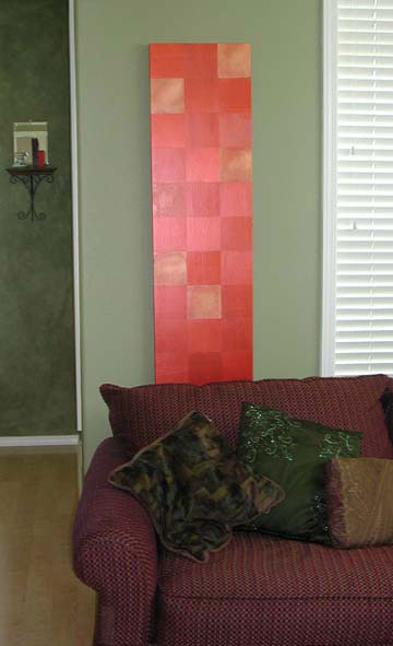 CHEQUERED METAL - Coppers To create a striking, but not overwhelming effect, multiple copper-colored products were applied to a wood panel in a chequered pattern. Benefits to applying decorative techniques to panels rather than walls are portability and reduced cost (due to smaller area). ![]() |