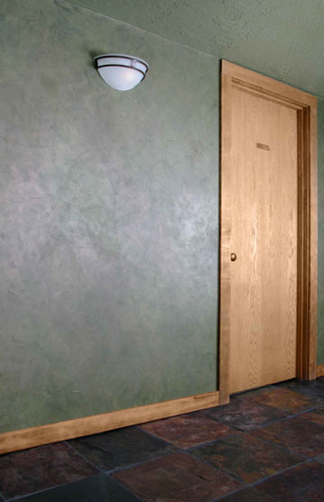 Using the colors of the slate floor as inspiration, layers of transulcent metalics in soft gold and copper with black pigments over color-matched Impasto create a warm and dynamic accent wall in an entry hall.