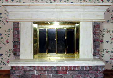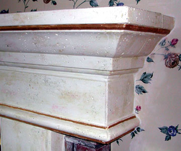 Layers of clear and colored waxes with layers of glazes combine to create a stone-like appearance on this concrete mantle. Touches of faux gilding accent the profile.